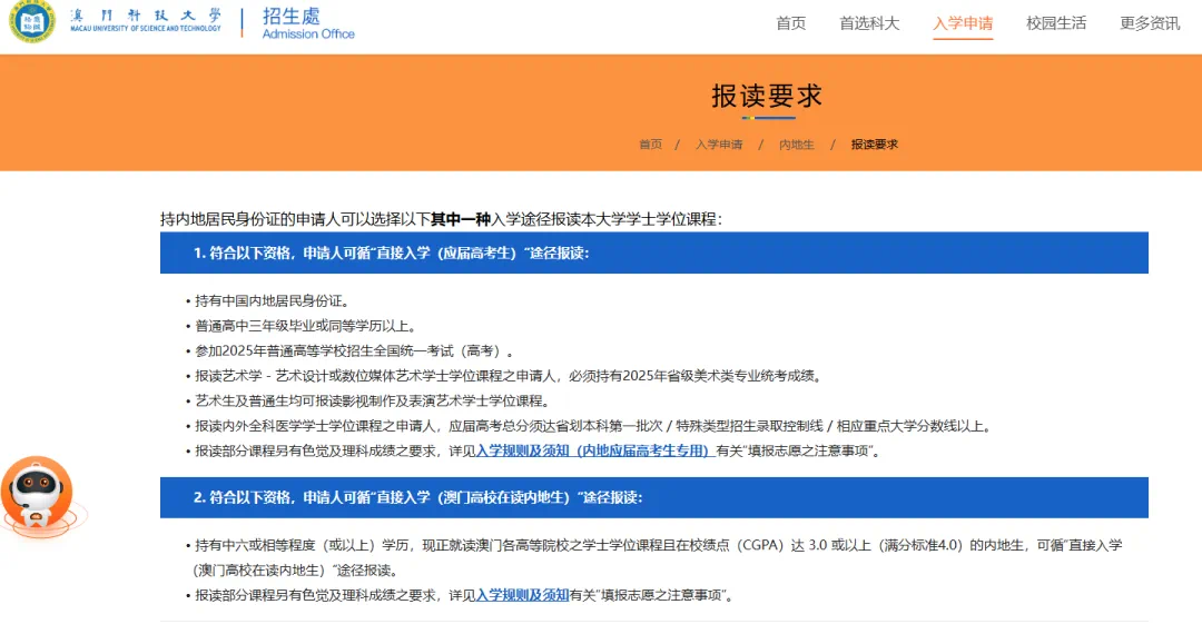 根据澳门科技大学官网的内地生报读要求显示,以“直接入学(应届高考生)”途径报读之考生必须持中国内地居民身份证及具有高中三年级毕业或同等学历以上,并须参加应届普通高等学校招生全国统一考试(高考)。部分课程会有特定的省级统考要求或理科成绩要求,详情请查阅“内地生入学规则及须知”内“报读资格”。