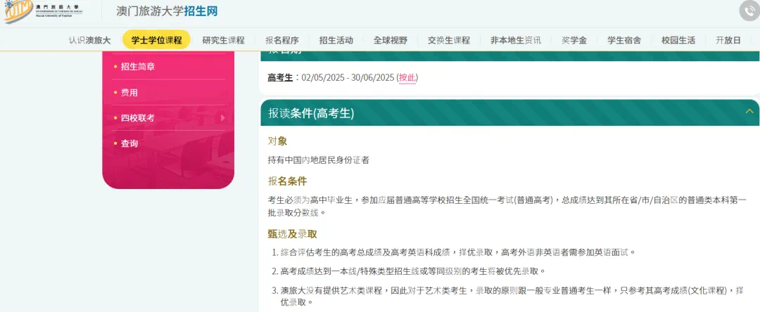 澳门旅游大学官网显示,内地生想要报读,必须为高中毕业生,参加应届普通高等学校招生全国统一考试(普通高考),总成绩达到其所在省/市/自治区的普通类本科第一批录取分数线。该校也会综合评估考生的高考总成绩及高考英语科成绩,择优录取。