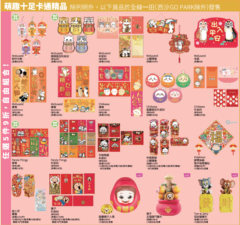 优惠期间还有多款贺年礼盒、糖果、云食、美酒等,如东京人气手信New York Perfect Cheese芝士饼、日本拉面名店礼盒及甜蜜日本水果礼盒。另外亦有一系列可爱卡通贺年利是封及挥春,如Chiikawa、mofusand、Pokemon、Panda Things及Pokemon等,亦有精选奶龙、Kuromi、Melody等床品。
