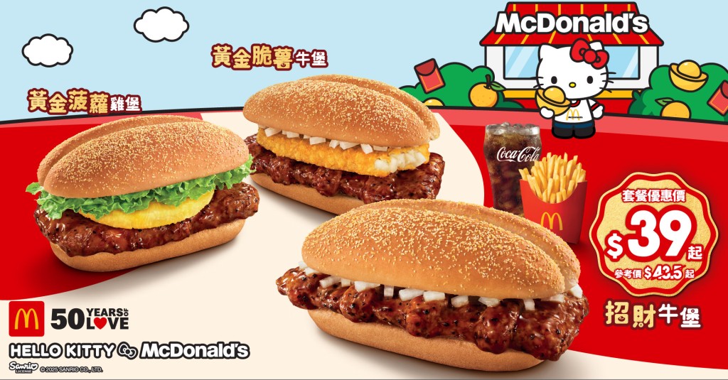 麦当劳优惠|新春佳节即将来临,McDonald's 麦当劳携手超人气角色Hello Kitty推出限时限定的招财福堡系列及多款应节美食,如扭扭薯条、红豆年糕批、小龙虾汤等,同时,麦当劳App用户还可享受独家优惠,购买指定食品还可以免费获得一套四款的经典利是封!