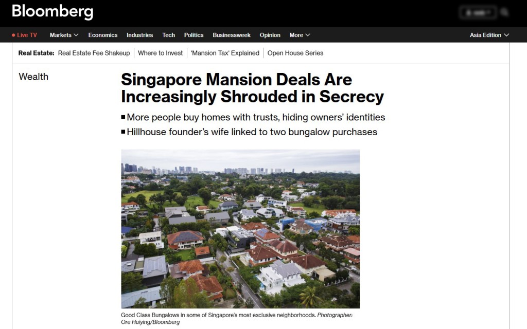 ▲彭博去年12月一篇地产报道揭露新加坡当地被称为“优质洋房”(Good ClassBun房)的顶级豪宅交易日益不透明。