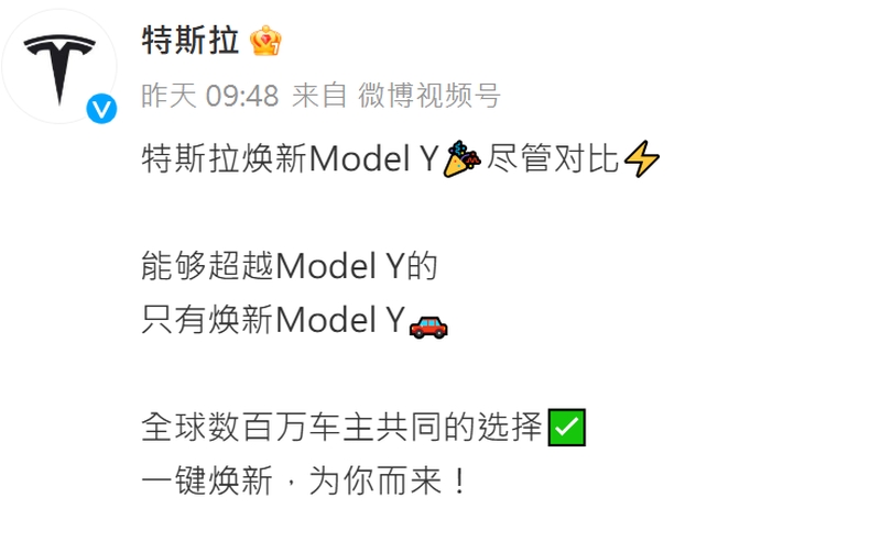 ▲特斯拉中国焕新版ModelY突上线发售,宣传语“尽管对比”。