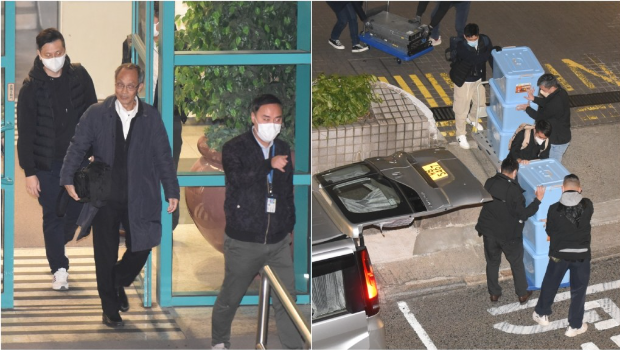 ▲至傍晚,钟庭耀及两名相关民研职员被带返警署助查。