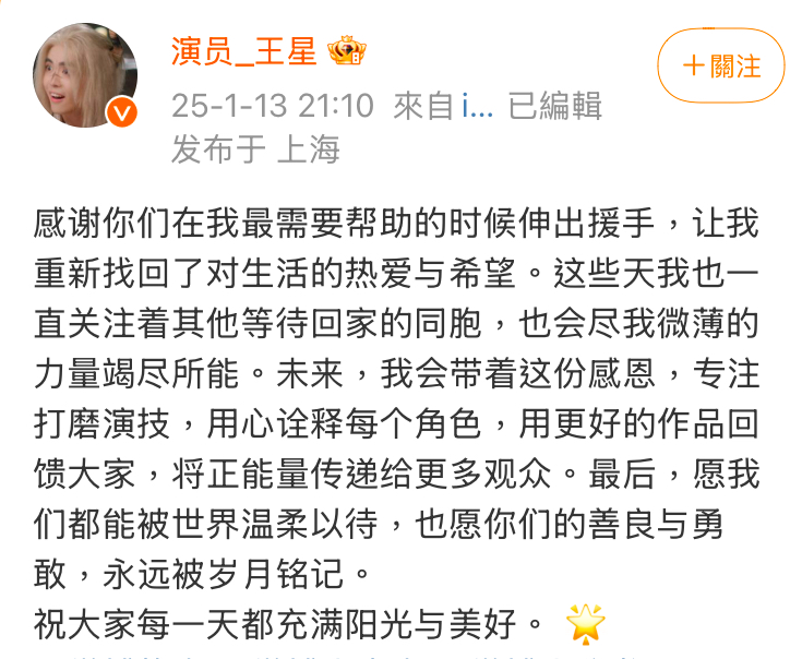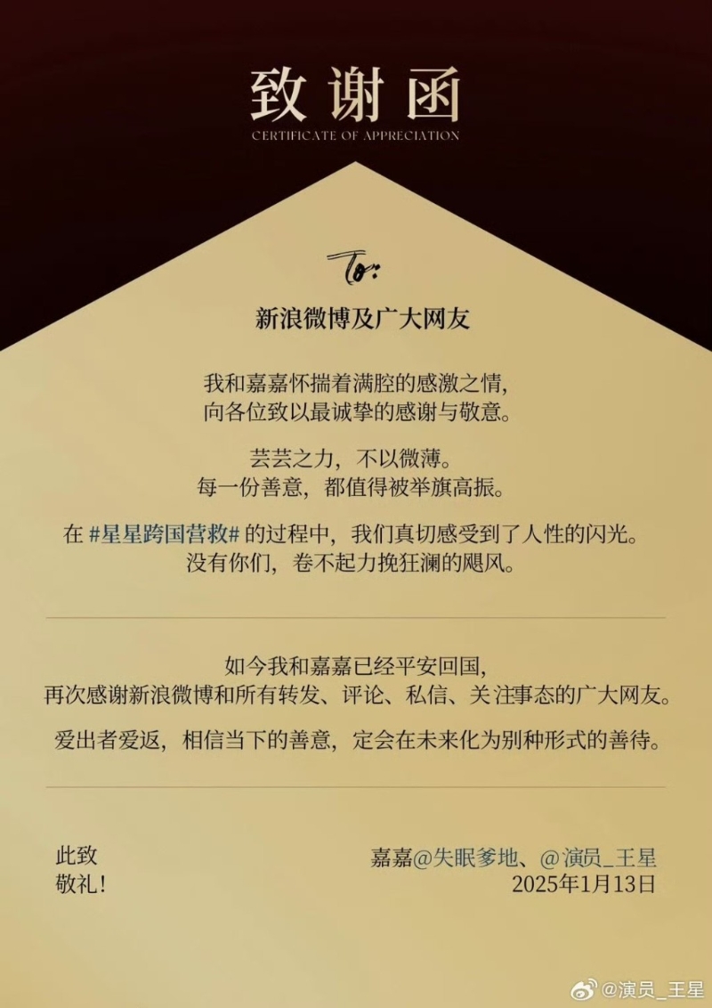 王星写道:“感谢你们在我最需要帮助的时候伸出援手,让我重新找回了对生活的热爱与希望。这些天我也一直关注着其他等待回家的同胞,也会尽我微薄的力量竭尽所能。”