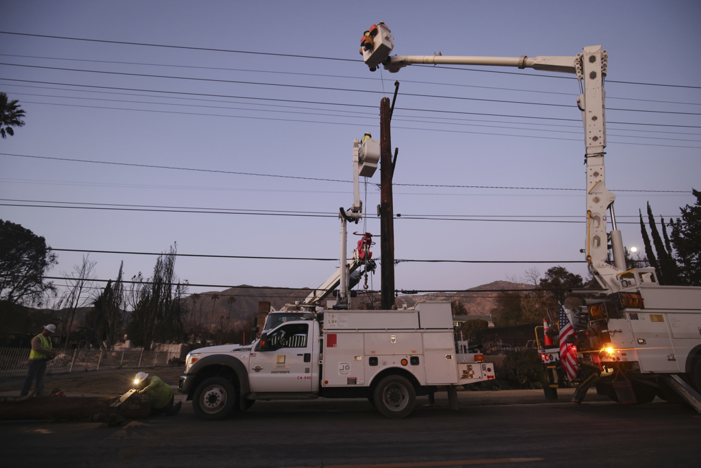 ▲2025年1月12日,南加州爱迪生电力公司(Southern California Edison)的工人在伊顿大火(Eaton Fire)过后,对一根电线杆进行维修。(图/美联社)