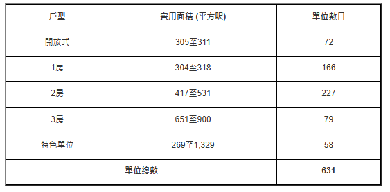 据楼书显示,面积最细及最大均属特色单位,为1B座3楼J室,面积269方呎,并连98方呎平台,属1房间隔;面积最大单位则为1A座26楼A室,面积1329方呎,连274方呎平台以及1336方呎天台,属4房套连储物室间隔。
