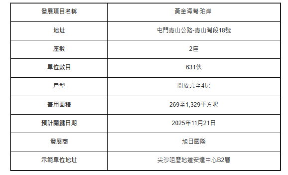 黄金海湾‧珀岸为黄金海湾发展项目的第2期,规划包括第1座及第2座,其中1座再细分为1A及1B座两座,合共提供631伙,当中9成单位享有海景,步行2分多钟直达黄金泳滩。