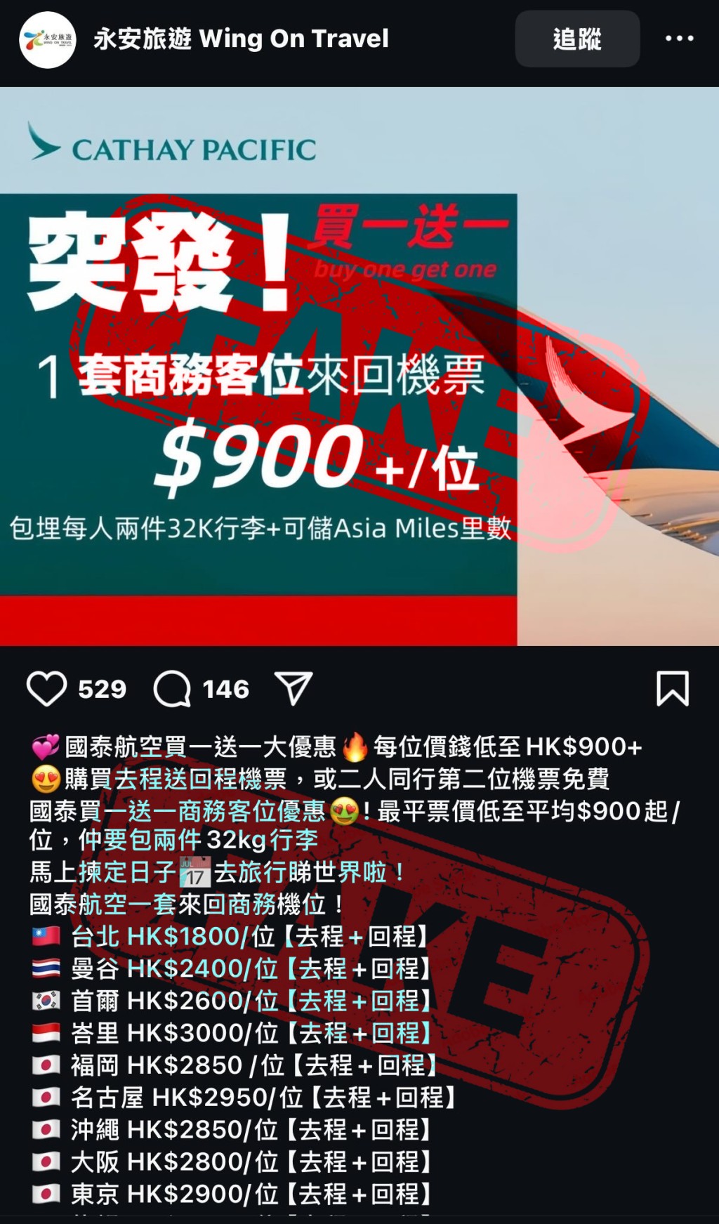该名女学生发帖,表示自己于Instagram浏览到一则自称“永安旅游”的广告帖文,讹指可购买特价国泰商务舱来回机票。她透过WhatsApp联络骗徒电话“7093 7570”,骗徒声称不接受信用卡支付,又附上一张附有印章的截图,试图令人更加信服。最终女事主不虞有诈,昨日(1月13日)下午7时许以Payme支付5200元。Payme截图显示,收款人为“Wing On Travel Limited”,与永安旅游公司官方名称“Hong Kong Wing On Travel Service Limited”十分相似。