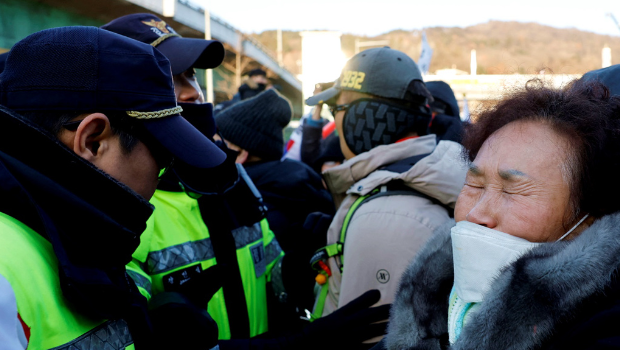 韩联社报导,当地时间上午8时40分,传出尹锡悦有意自行离开官邸、前往公调处总部接受调查,消息传出后,聚集在龙山区汉南洞总统官邸前的尹锡悦支持者纷纷哭泣,问道:“这是什么?”