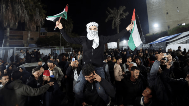 ▲2025 年1 月15 日,在加沙走廊中部的代尔巴拉赫,巴勒斯坦人在街头庆祝达成停火协议。路透社