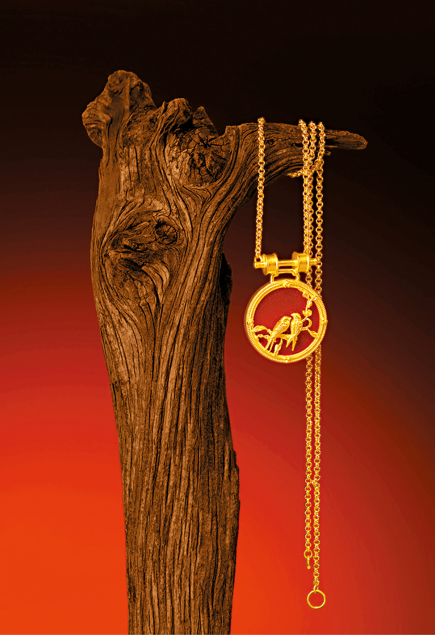 ▲传承系列“喜鹊传福”吊坠,饰以一对象征古代爱情的喜鹊,寓意幸福美满,此吊坠结合传统铸金技术与唐代雕红漆工艺打造而成。