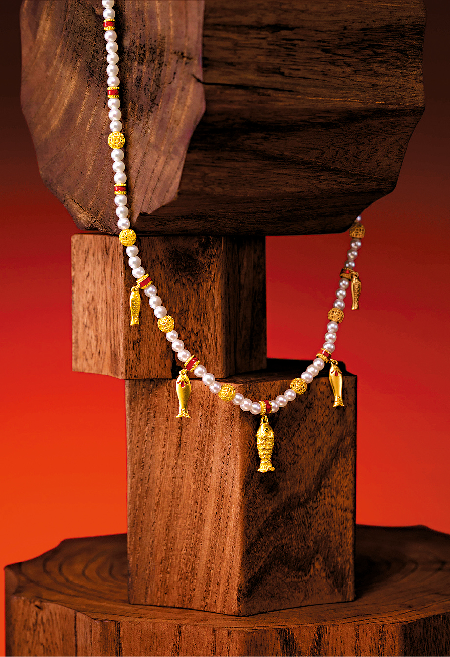 ▲以足金配珍珠创作的传承系列足金鱼项链, 各具特色的鱼儿造型吊饰,别致又富动感。