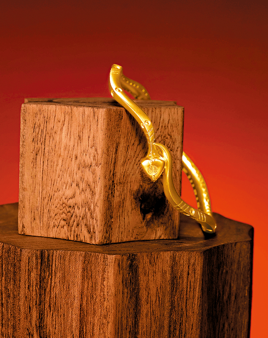 ▲造型偏向时尚风格的“金蛇献富”手镯,是传承系列之中,以韩美林画作启发设计的金饰之一。