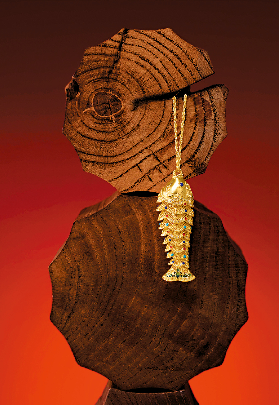 ▲传承系列“鱼裕丰饶”足金吊坠,采用铸金、花丝及铺金的传统黄金工艺技术制作,可摆动的尾部恍如鱼儿逆流而上,寓意坚毅与成功,纤薄的金片缀以鎏彩,精致亮丽。