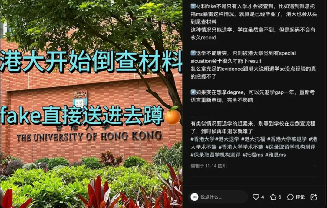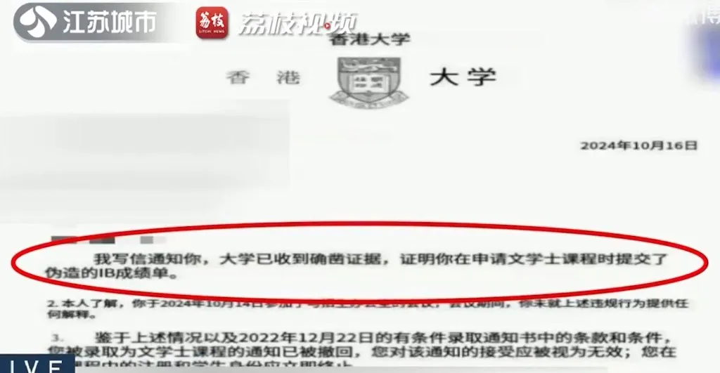 随后,李女士与女儿一同前往港大了解详情。原来,中介机构为李女士的女儿伪造了国际高中学生身份及成绩。港大在核实了李女士女儿的身份和成绩后,将其退学。