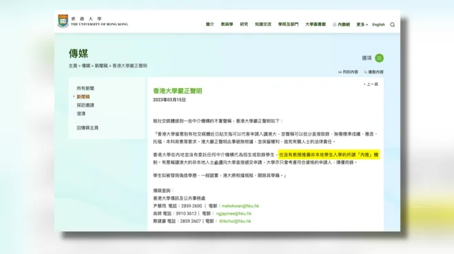 ▲香港大学曾发声明:没有教授推荐非本地生入学的所谓“内推”机制。