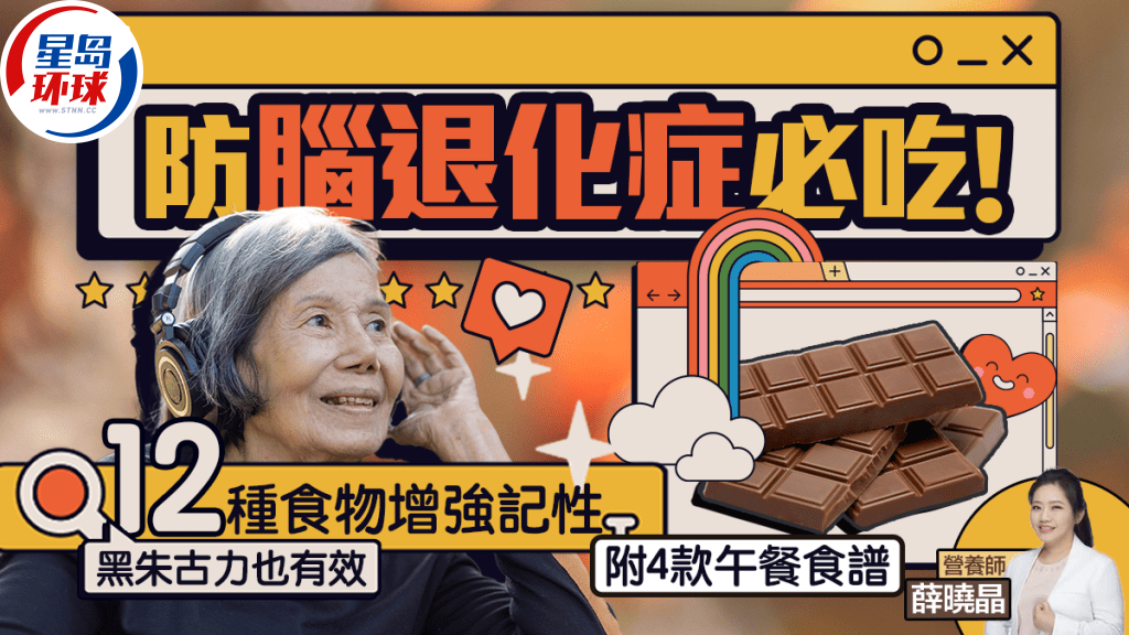 【认知障碍症/脑退化症】脑退化症越来越普遍,严重者更无法自理。 吃黑朱古力有助预防? 有营养师推介12种食物,有助维持脑部健健康,增强记忆力,预防脑退化症。 她也推介4款午餐食谱,补脑、稳定血糖!