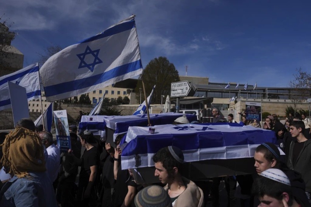 ▲以色列反对加沙停火的抗议者,抬着棺材在耶路撒冷法院前抗议。(图/美联社)