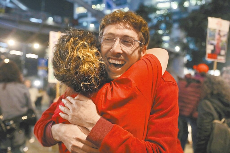 ▲在以色列特拉维夫街头,人们拥抱庆祝达成协议。新华社