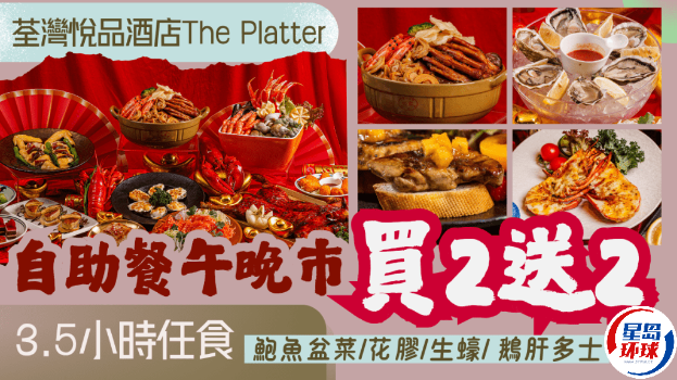 香港荃湾悦品酒店The Platter自助餐买2送2优惠!今日(1月17日)中午12时起,透过KKday预订即可以低至$209/位的价钱享用全新的“海之诱惑/蛇来运转”新春海鲜自助午餐及“鹅肝花胶贵族/蛇来运转”新春臻选自助晚餐,任食鳕场蟹脚、避风塘炒濑尿虾、鹅肝多士、云腿花胶鹅掌、焗芝士波士顿龙虾及即开生蚝等多款菜式!连农历新年期间的年初一至五亦继续供应,即睇荃湾悦品酒店自助餐优惠详情!