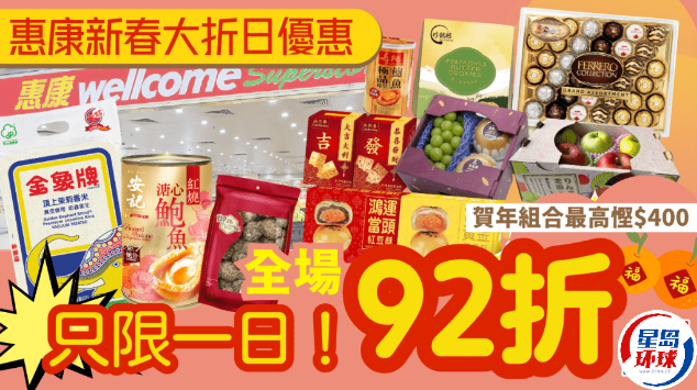 惠康新春优惠|临近农历新年,惠康超级市场特别推出迎春“大折日”优惠活动,顾客于1月18日到全线惠康门市或选用“网购店取”服务,买满$168即可享92折优惠,而于网店买满$988亦可享同样优惠,只限1月18日一天!惠康同步推出多项精选货品优惠组合,最多可悭$406.4,把握机会入年货!