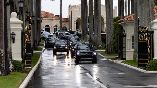 ▲特朗普与亚当斯会面一小时后,车队离开高尔夫球场。Maddie McGarvey/纽约时报