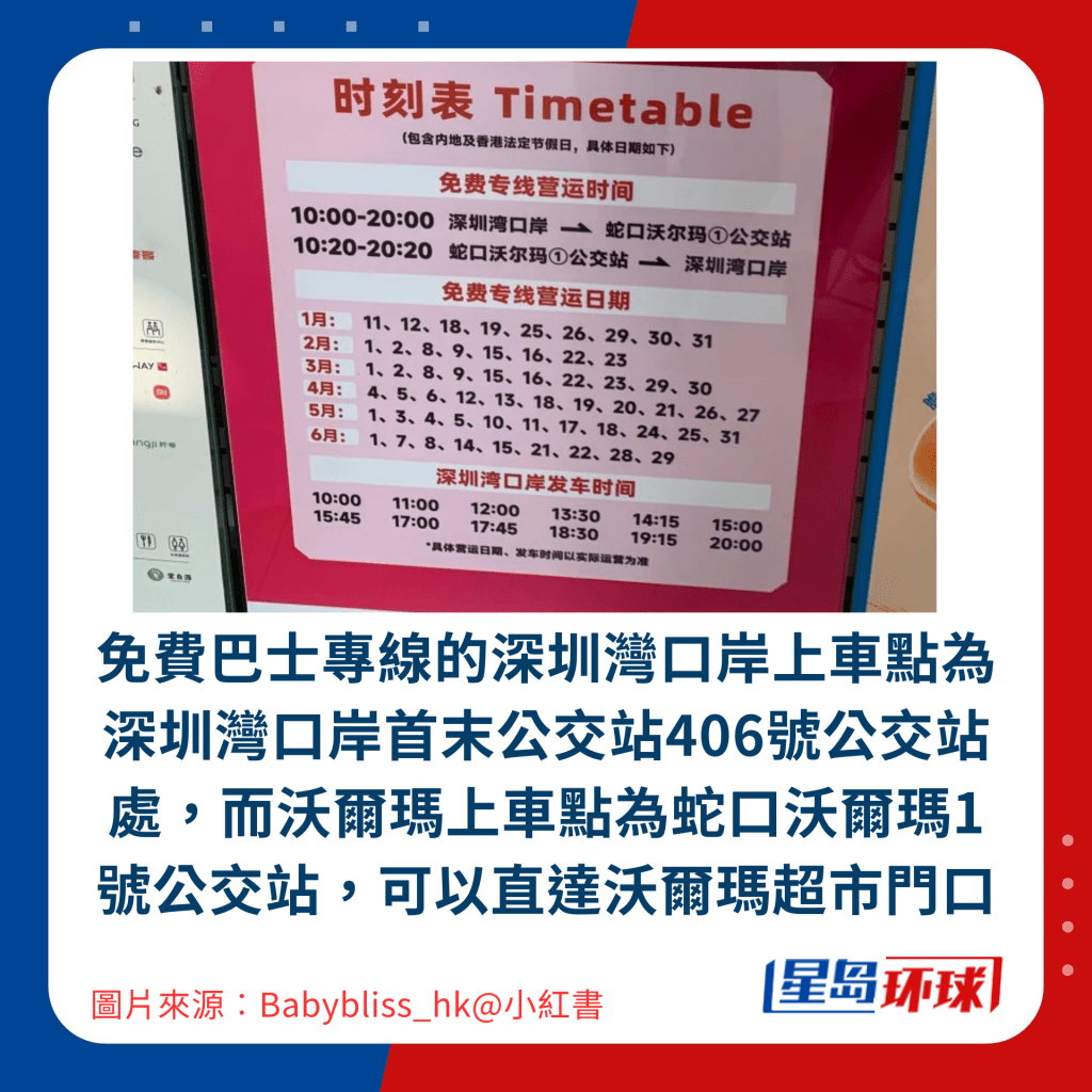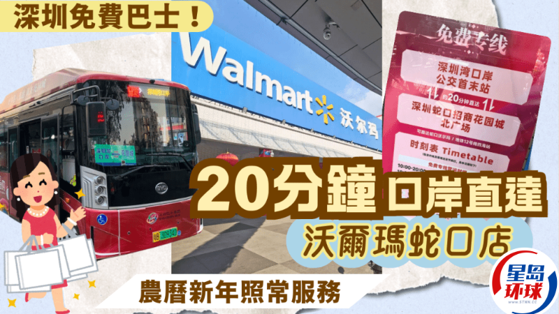 免费巴士专线的深圳湾口岸上车点为深圳湾口岸首末公交站406号公交站处,而沃尔玛上车点为蛇口沃尔玛1号公交站,可以直达沃尔玛超市门口,同时也能前往地铁12号线四海站,乘搭地铁前去深圳其他景点及商圈。 按时间表显示,农历新年期间的大年初一至初五(即1月29至2月2日)亦有提供免费巴士服务,惟要留意营运时间。