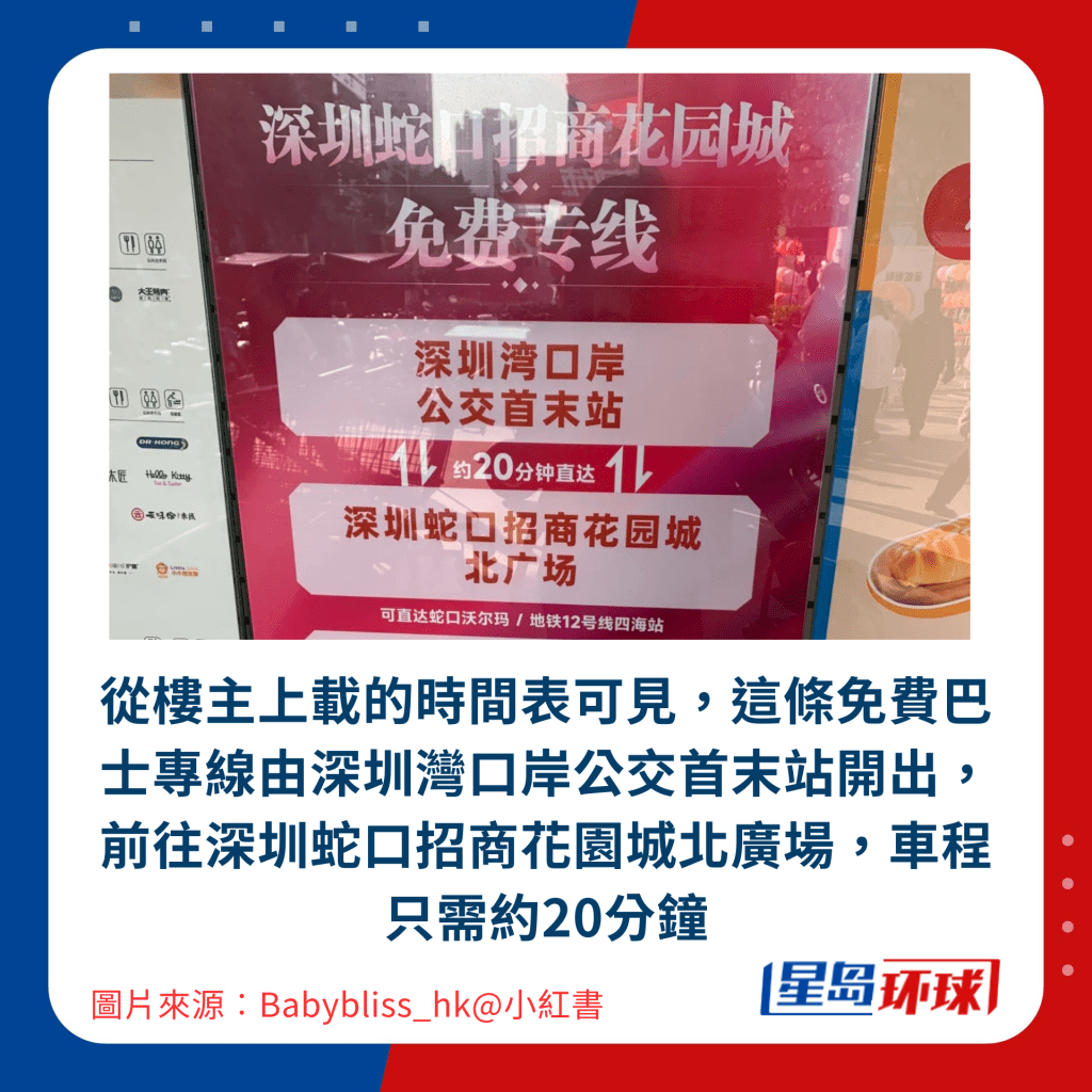 随着深圳地铁13号线开通后,经深圳湾口岸往返内地的港人愈来愈多! 加上旅客现时可经设于口岸的多条免费接驳巴士路线,前往深圳多个人气商场及商圈,交通更方便快捷。 最近,有网民发现深圳湾口岸有一条免费巴士路线“深圳蛇口招商花园城免费专线”,车程只需约20分钟,即可直达沃尔玛蛇口店,就连大年初一至初五期间亦照常服务,港人可把握机会在农历新年长假北上扫货玩乐及品尝美食!