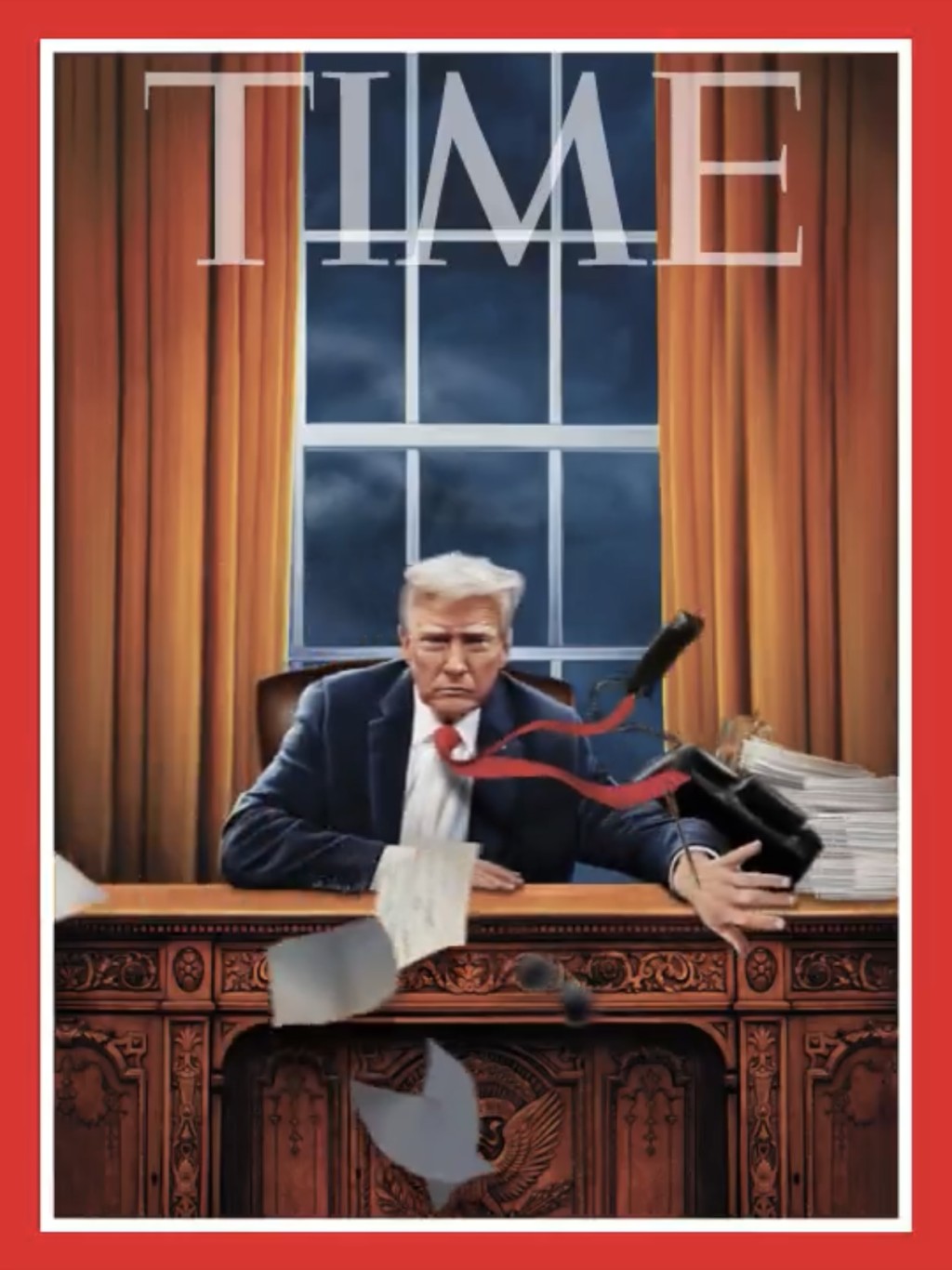 特朗普重返白宫成为第47任总统,《时代》杂志公布最新封面,显示特朗普回归椭圆形办公室“坚毅桌”,单手将桌面扫清,大堆文件和电话,包括拜登最爱的太阳眼镜也飞走。
