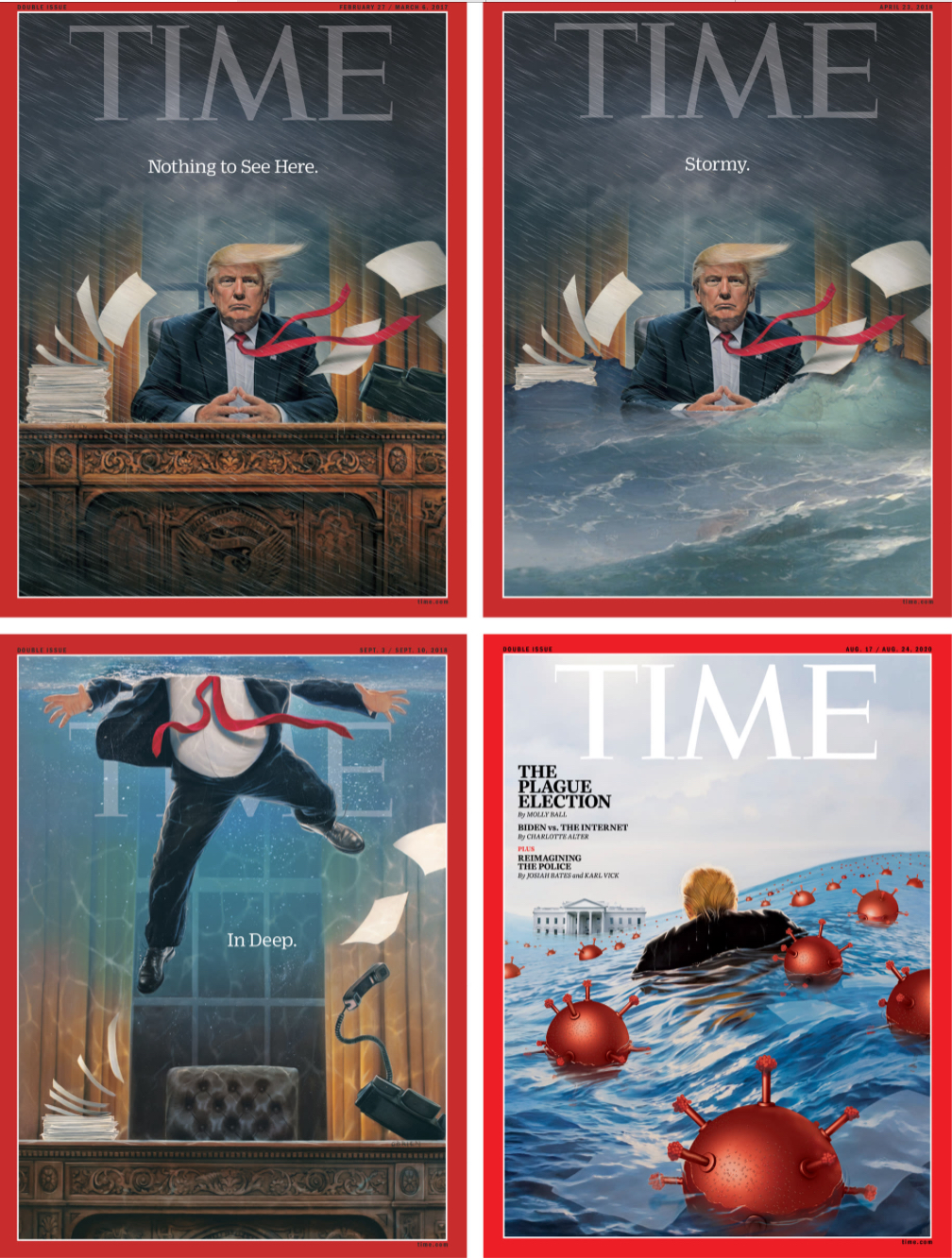 这期封面插图出自艺术家奥布莱恩(Tim O'Brien)之手,已是同系列的的第四个封面。在这系列画作中,特朗普原本坚定地坐在总统办公桌上,但四周从刮风到淹水,再到“没顶”,最后特朗普被冲出外面,在水里一堆病毒中遥望白宫。副题形容特朗普的状态从刚上任一个月时的“这里没什么看头”(Nothing to See Here),到爆出艳星掩口费案时的“风起云涌”(Stormy),再到深陷各种丑闻时的“水深火热”(In Deep)。