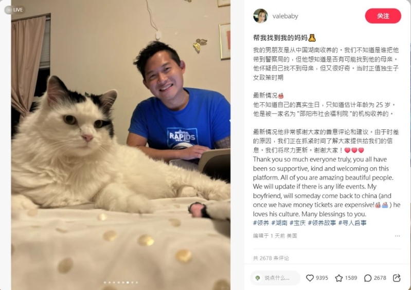 ▲获美国父母从湖南收养的华裔男子,在小红书求助寻亲。小红书