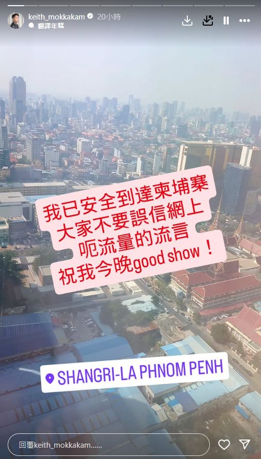 ▲莫家淦在IG透露︰“我已安全到达柬埔寨,大家不要误信网上呃流量的流言,祝我今(昨)晚good show!”