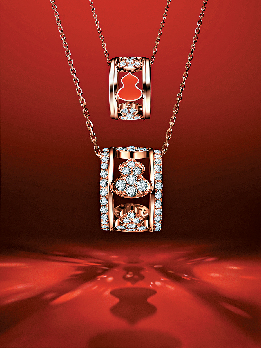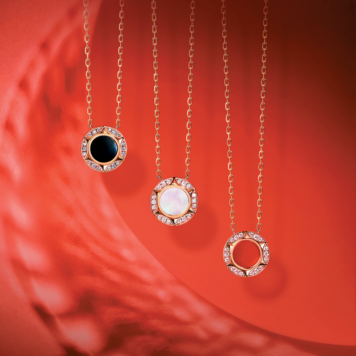 除了生肖主角蛇,中国传统也有不少吉祥图腾。Qeelin从独特的新春文化吸取灵感,并以现代设计语言重新演绎,将寓意“福禄”的Wulu(葫芦)打造成全新的Wulu Eternity系列,圆形有着圆满和谐之意,当中旋转物象征正能量的流动与回圈,合二为一成为提升运势的幸运符。此系列以18K玫瑰金与白金材质制作,环形吊坠镂空饰以镶钻Wulu,另一款则缀以招牌麒麟红的HyCeram陶瓷Wulu,迎合新年喜庆氛围。另一边厢,Hearts on Fire的LU Droplet系列钻饰,灵感源自破晓时份的晶莹露珠,象征新年伊始的美好景象。