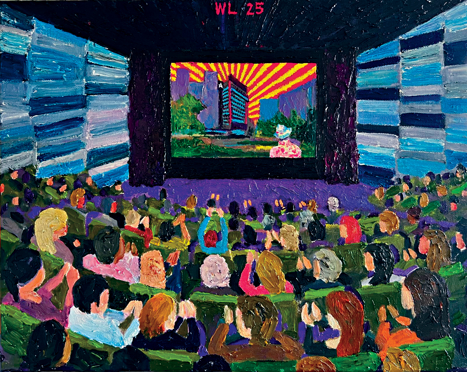 芸芸参展作品中,包括一幅来自香港收藏家、艺术家兼建筑师林伟而的作品《喝采》,是他特意为艺博会绘制,画中描绘了香港艺术中心的古天乐电影院内场,银幕上的香港艺术中心被璀璨的光环所环绕,周边的观众正热烈拍掌。他说创作灵感来自于他参与香港艺术学院举办的油画课程,该课程正好奠定了其油画技术的基础,“光环象征了香港艺术中心在推动当代艺术和文化交流上扮演 重要角色。” 画作另一彩蛋是画家将自己也描绘在画中,“寓意此处承载的共同回忆及对自己的意义。”