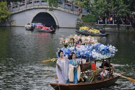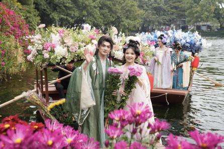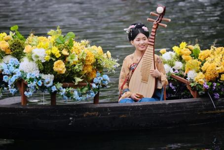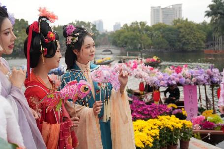 The waterborne flower market made a grand debut at Liwan Lake Park on January 22, with a lion dance carrying Lingnan-style culture as the opening celebration. This market integrated folk customs with activities, creating a series of wonderful programs both on water and on land. People dressed in traditional Chinese clothing were selling the flowers, bringing back the prosperous scene of the waterborne flower market in the past.