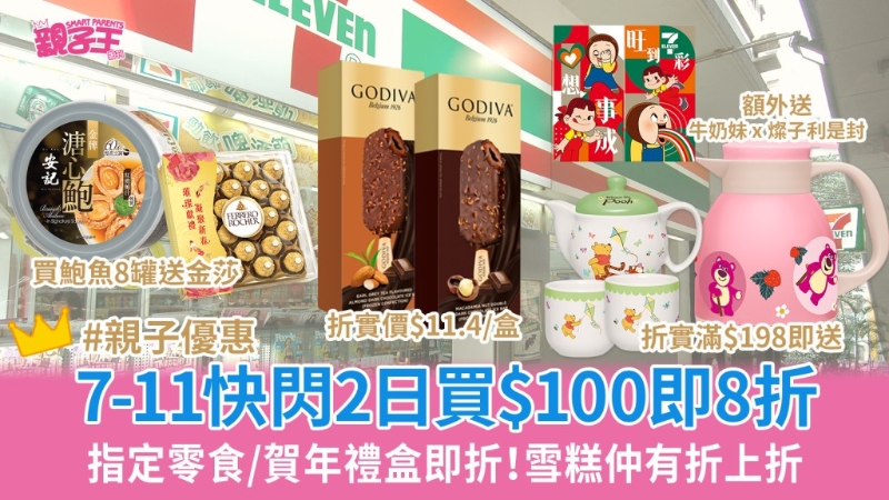 去拜年当然要先办年货,就趁今日(24日)7-11有2日快闪新春优惠,于1月24及25日买满$100即有8折去扫货喇! 就连雪糕、指定零食都满$100有8折,折实满$198再送上迪士尼“双层真空暖暖壶”或“趣致 Tea Set” ,还额外送“不二家牛奶妹 x 灿子利是封”,提提大家,雪糕更有折上折优惠,即刻去7仔扫货喇!