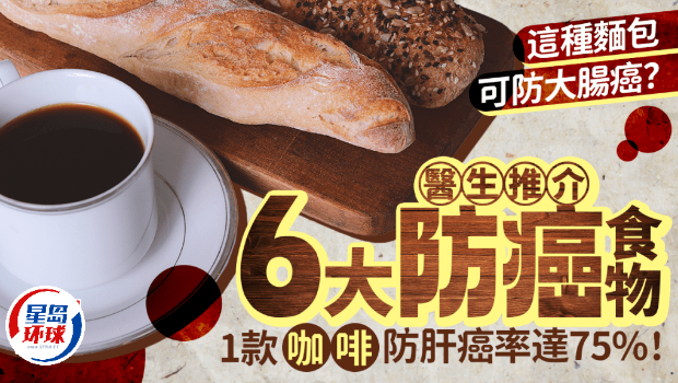 【防癌食物】吃1种面包可防大肠癌?有医生推介6类被证实有效预防癌症食物,减低患上胃癌、乳癌、子宫内膜癌、肝癌、大肠癌等风险。其中,适当饮用1款咖啡,患肝癌的风险可减达75%!