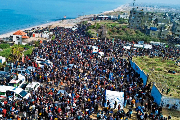 ▲加沙中部努塞拉特地区周日有大批巴人聚集,准备返回加沙北部的家园。