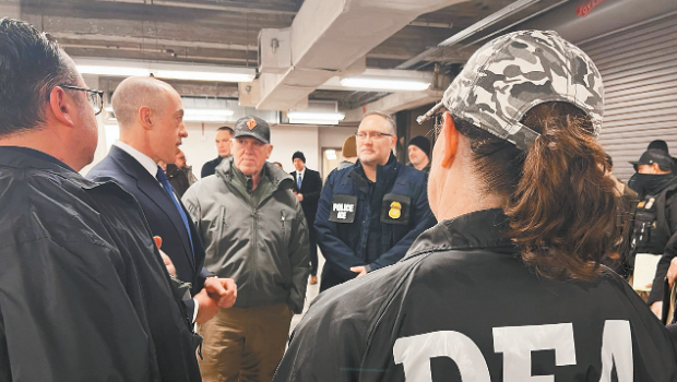 ▲司法部代理副司法部长博夫(左二)前往芝加哥监督扫荡移民情况,ICE证实,芝加哥的针对性行动已于26日开始。图为博夫与各个执法团队讨论安排行动。 芝加哥缉毒局图片