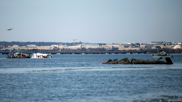 ▲美国航空(American Airlines)子公司PSA航空客机与黑鹰直升机空中相撞酿成67死,30日已找到客机上的2具黑盒子。图为30日漂浮在河面上的客机与黑鹰直升机残骸。(美联社)