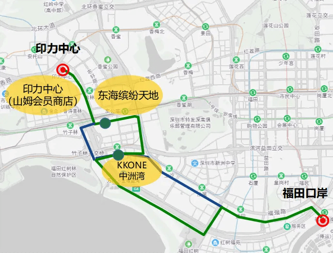 福田免费接驳巴“福田欢乐购”每逢周末及香港公众假期营运,分为A线及B线两条专线,其中A线的首末站为福田口岸至印力中心,途经KKONE中洲湾、东海缤纷天地、印力中心等,往印力中心的服务时间为上午10时至晚上7时; 往口岸的服务时间为下午12时至晚上9时,每30分钟一班车。