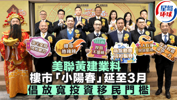 美联集团与鋑联控股举行新春传媒团拜,美联集团主席黄建业表示,虽然蛇年早春,但是楼市却现“迟来的春天”,成交量暂未见显著回升,主要原因是市场观望“财政预算案”,预期“楼市小阳春”或延迟至3月出现。他认为,蛇年经济多变,“财政预算案”成后市关键,希望政府提出进一步振兴经济及楼市的措施,并提出建议以“吸纳外资,拓内需,减财赤”。