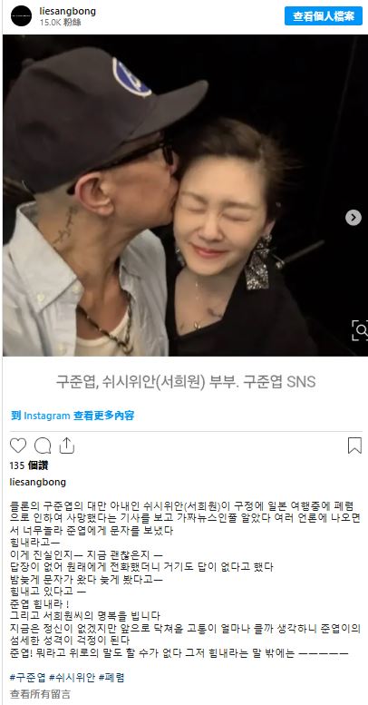 具俊晔今晚终现身,以黑图配合中文及韩文发文在IG写下对大S的思念,全文如下:
