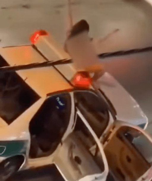女子其后爬上警车,背着挡风玻璃坐在车头盖上,且张开两腿,又高举双臂大喊,影片至此结束,女子其后情况不明。