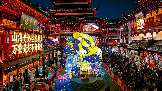 本届的豫园灯会,延续去年以中国神话典籍《山海经》为蓝本创作的“山海奇豫记”主题,透过丛林篇述说万物美好与众生奇妙,并由蛇年生肖主灯与鸟兽造型装置营造和谐场景。直至2月28日,更可在豫园商城华宝楼三楼看到“不止灯彩——豫园灯会30年暨中国彩灯艺术展”,在此展示13盏由秦、汉至明、清的古灯、10幅小校场年画,以及全国8地的灯艺非遗大师代表作,成为视觉与文化的盛宴。