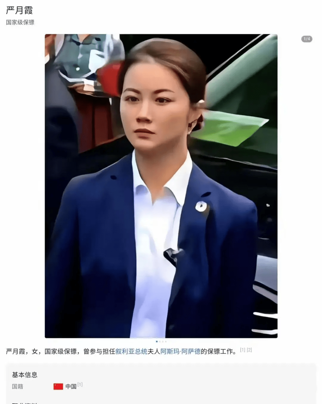 出生于河南武术世家,严月霞从小就展现出了对武术和搏击的浓厚兴趣,凭借着超乎常人的毅力和努力,她在武术领域不断深耕,曾进入少林寺深造,练就了一身本领。 她以优异的成绩考入北京体育大学武术专业,更曾打败过5位日本空手道冠军。 武林中人皆对这位天才钦佩不已,尊称她为“河南花木兰”。 严月霞成年后曾参军,军旅生涯更让她学会了射击、徒手搏击、反监视防护等技能,从单纯的武术爱好者成长为全方位的格斗高手。 退伍后,严月霞更成为中南海保镖。 2023年杭州亚运会期间,严月霞迎来了职业生涯中的一项重大任务——随护叙利亚第一夫人阿诗玛,当时就因清秀绝美侧颜,引起关注。