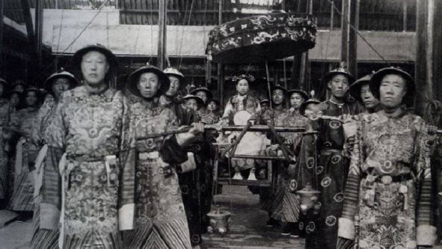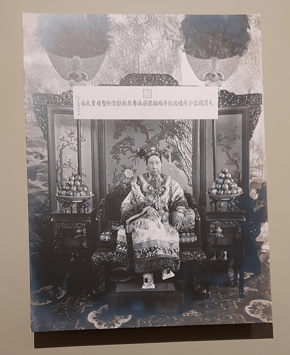 除此之外,慈禧也十分享受“老佛爷”这个称号,还留下了几张她扮作观音的照片,其中一张照片的画面中,慈禧身穿团花纹清装,外加五佛冠,左手捧着净水瓶,右手拿着一串念珠,太监李莲英则扮成佛教护法韦驮站在慈禧右侧,装扮成龙女的人则在她的左侧。
