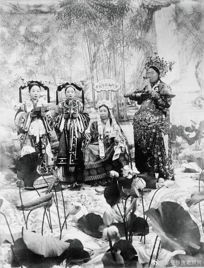 ▲慈禧爱扮观音拍照,左一为“三格格”、左二为“五格格”,右为李莲英。