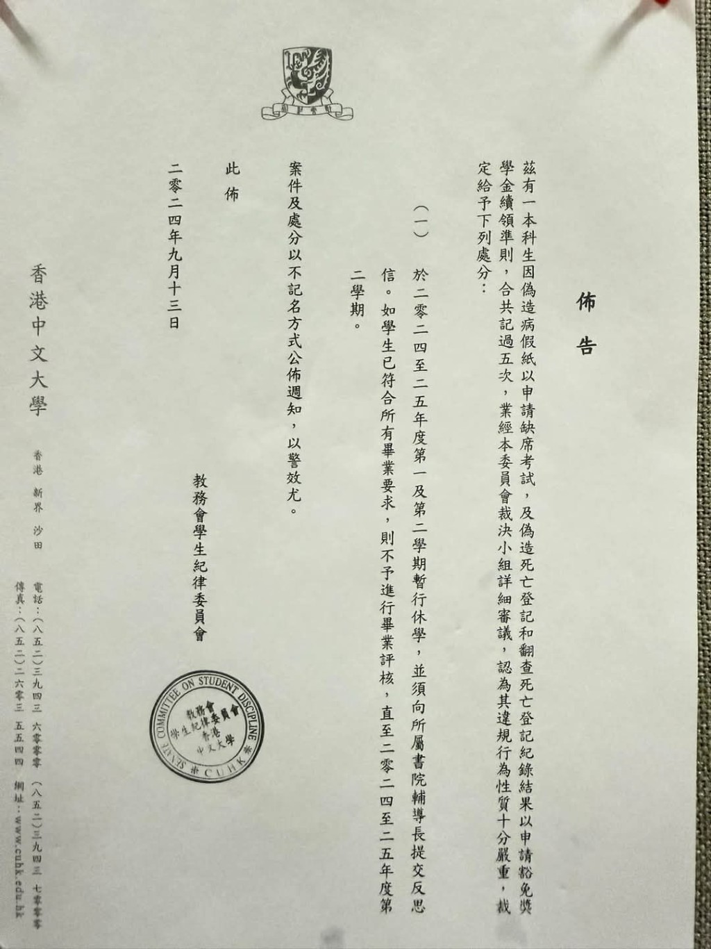 社交平台近日流传一张香港中大教务会学生纪律委员会发出的布告,指一名本科生伪造病假纸及伪造死亡登记和翻查死亡登记纪录结果,被罚包括记过5次及休学等一系列处分。中大回覆有关查询指,如确定学生有作出违规行为,校方将按程序作出适当处分,当中包括开除学籍。