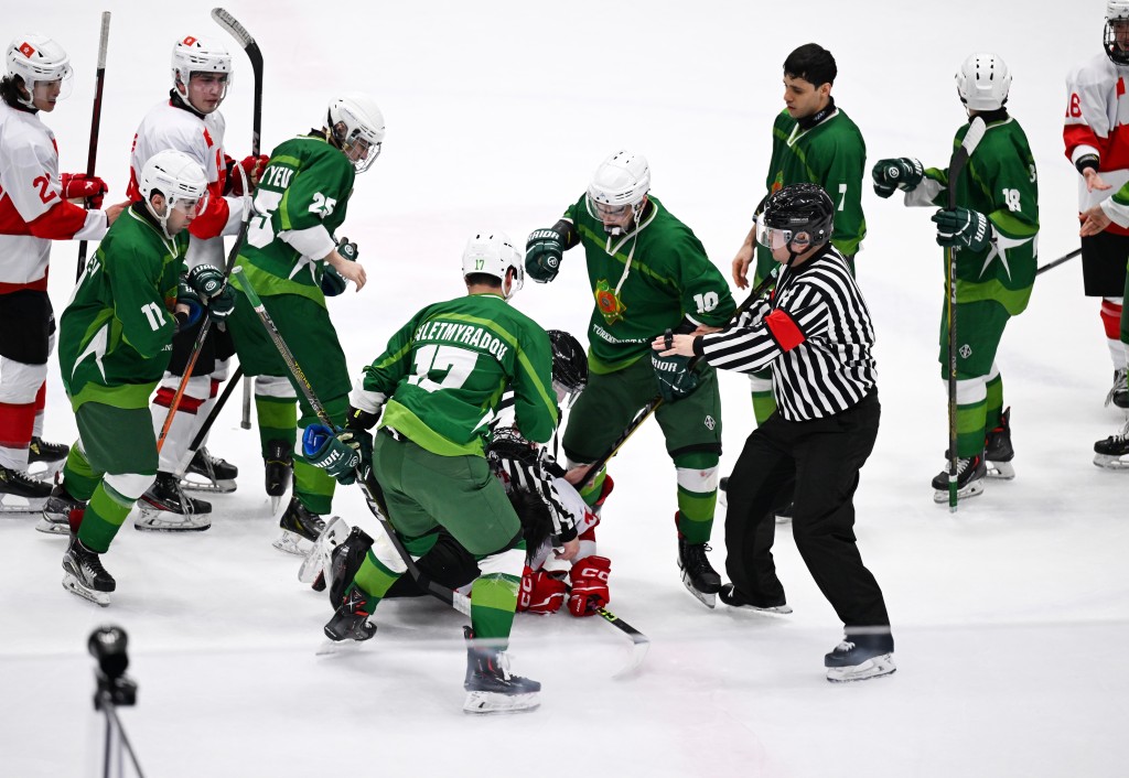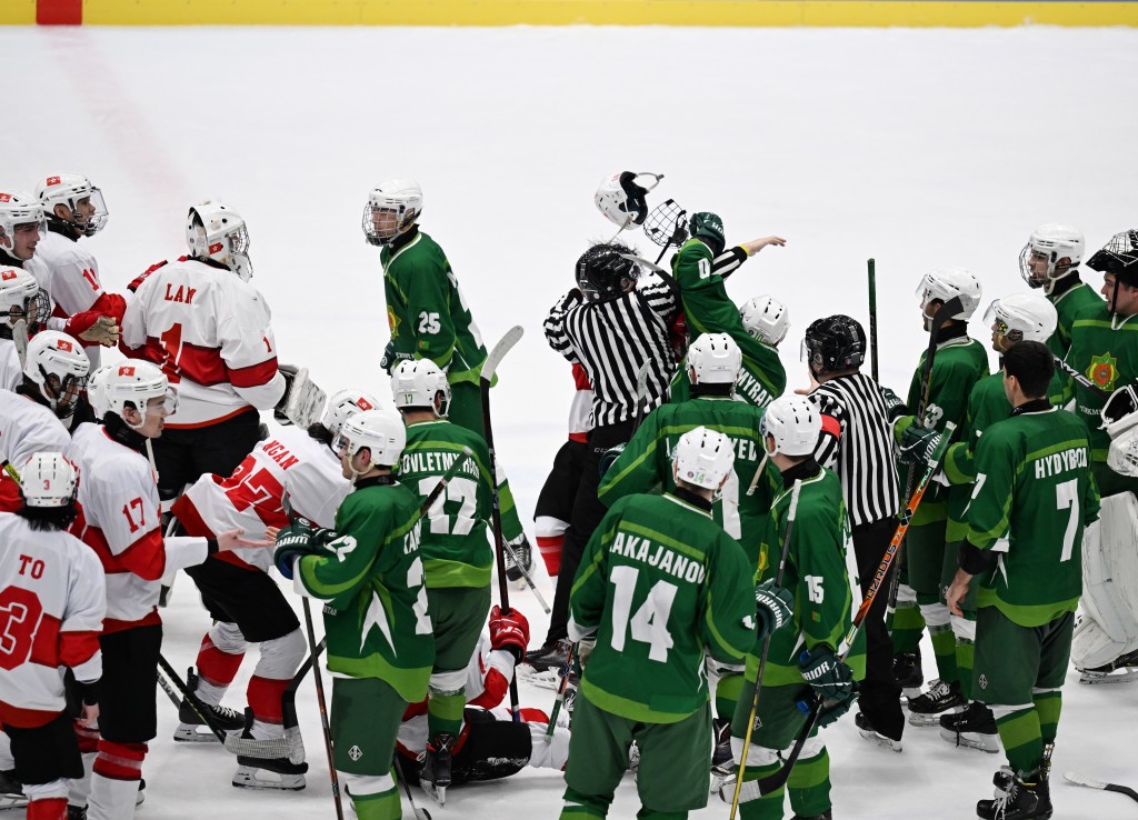 ▲香港冰球队在亚冬会比赛中与土库曼斯坦队(绿衣)爆肢体冲突。 新华社记者 李紫恒 摄